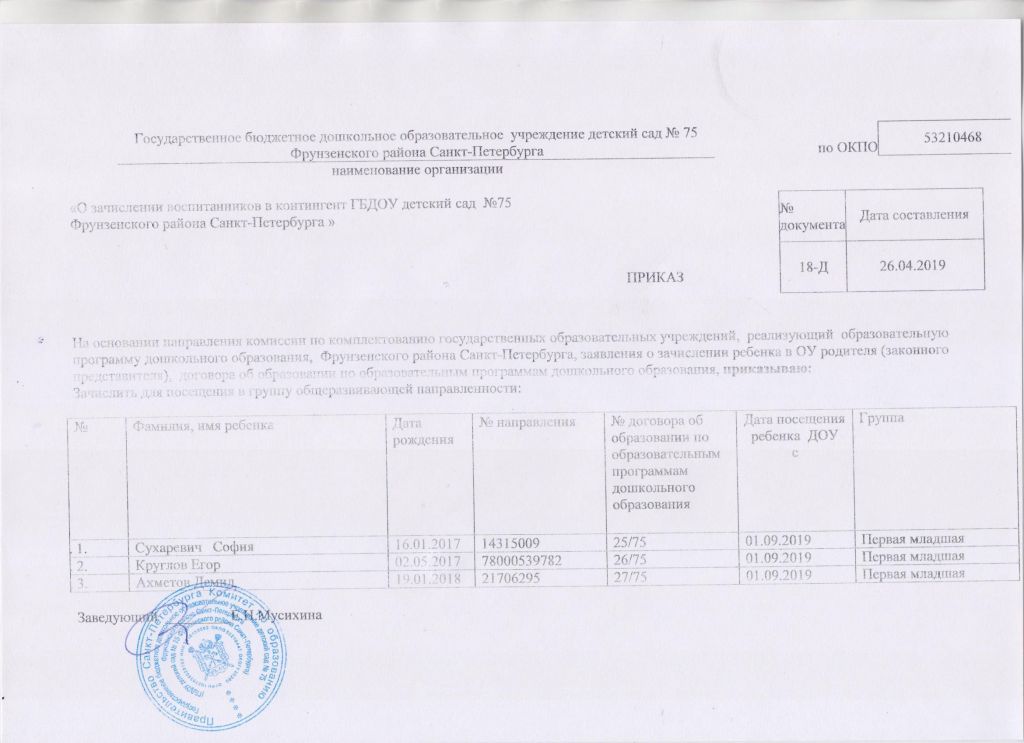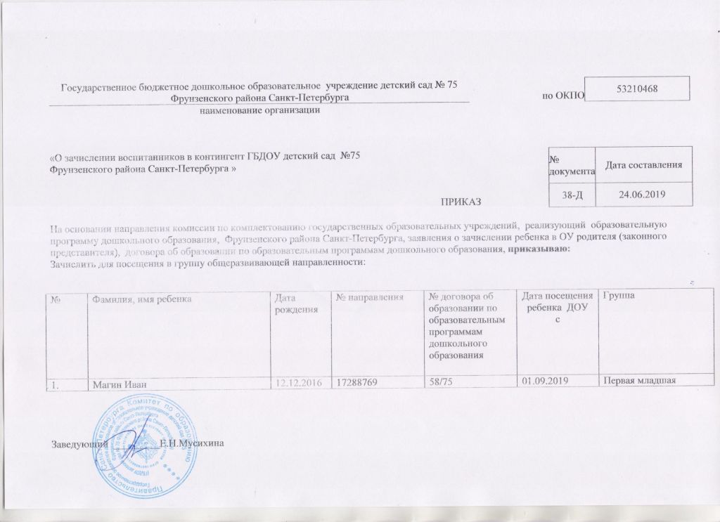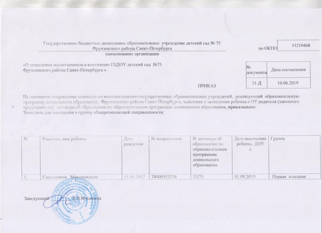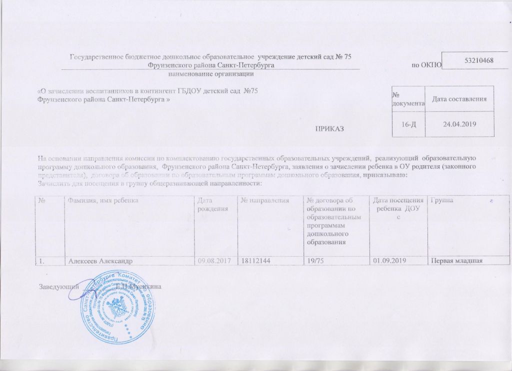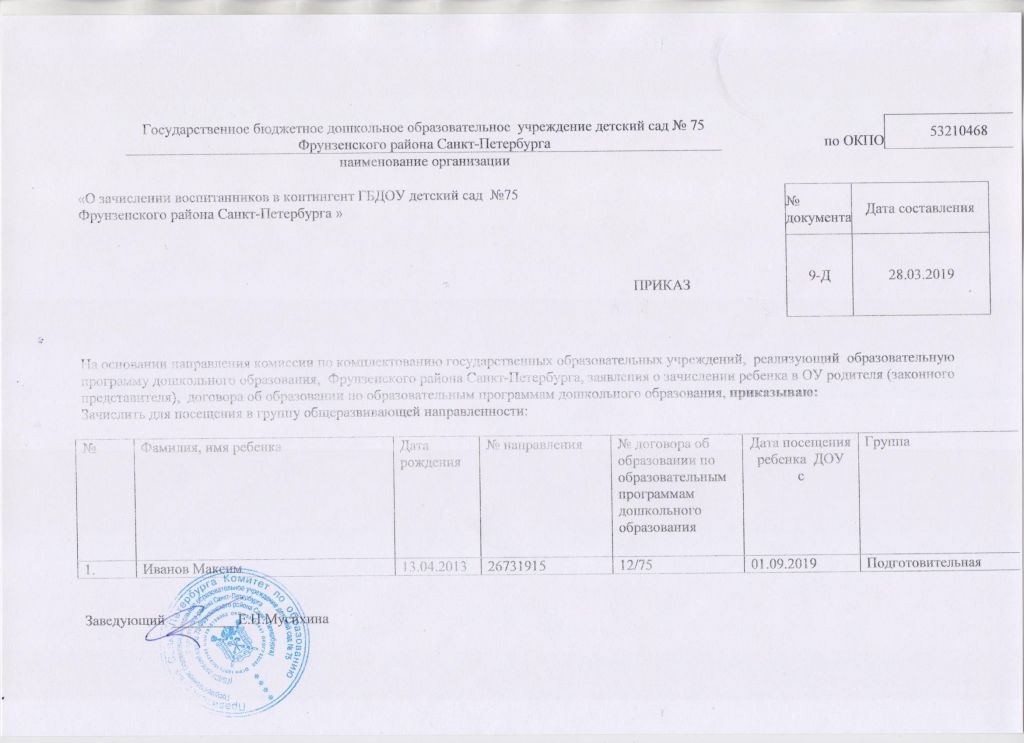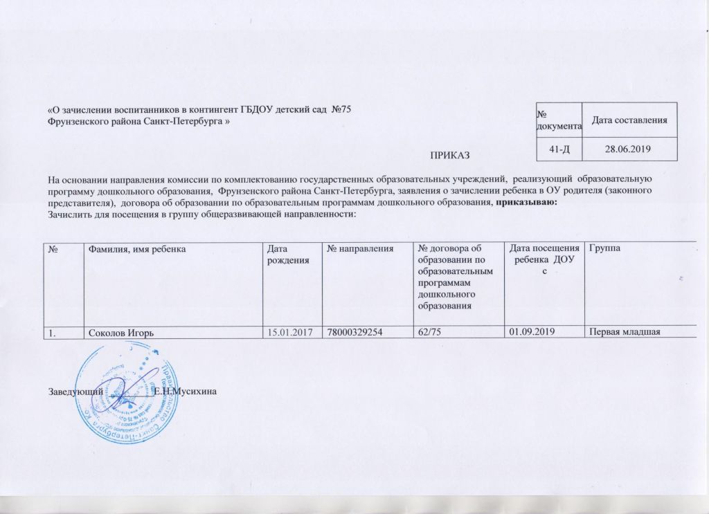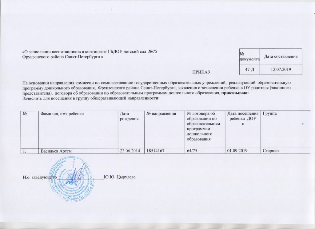 Распорядительный акт о зачислении ребенка в образовательную организацию