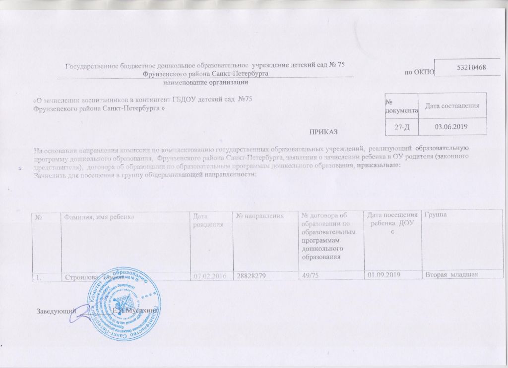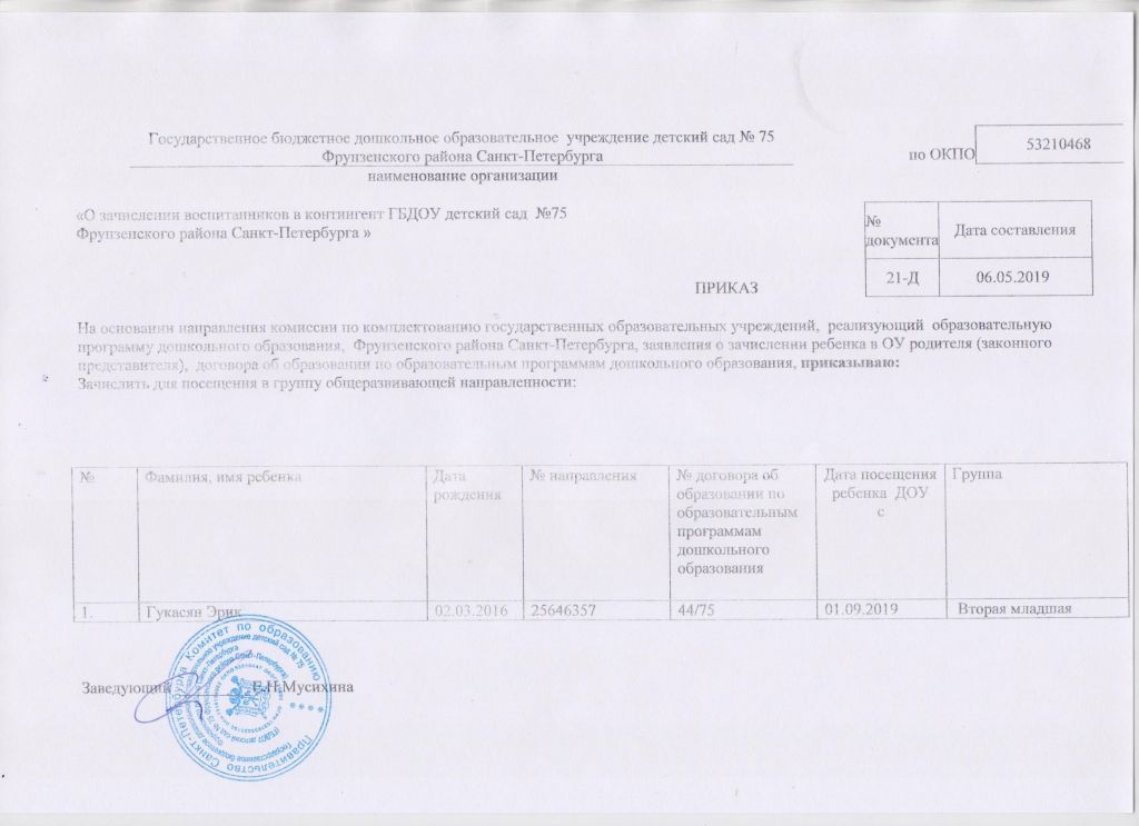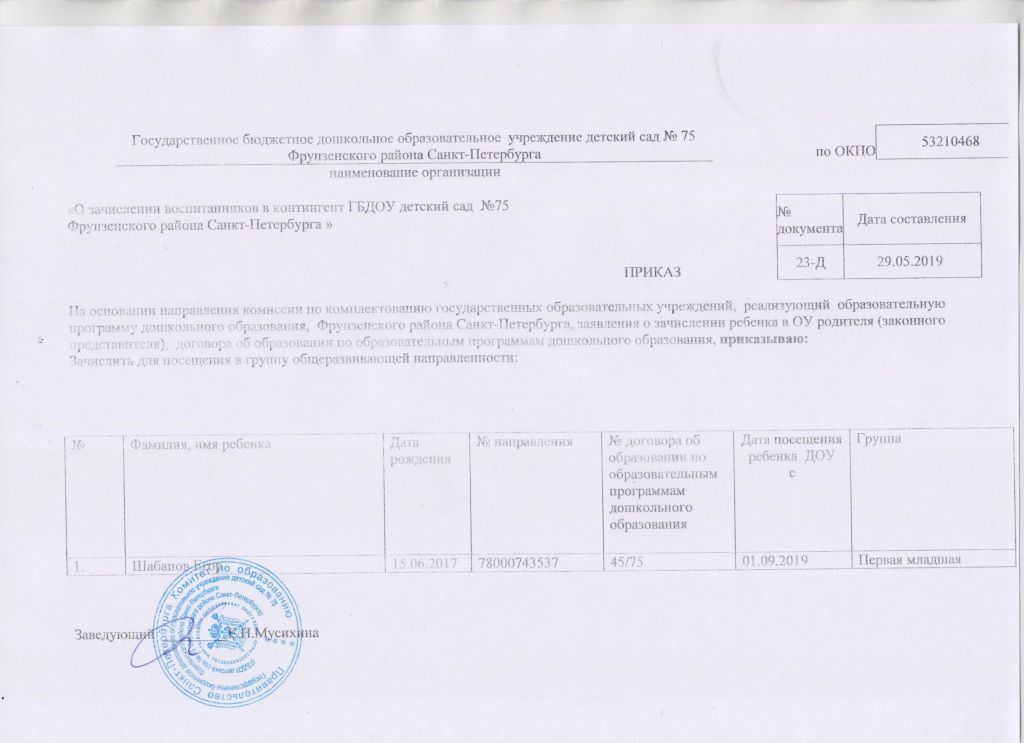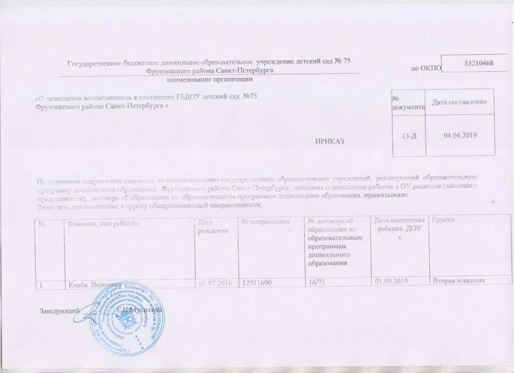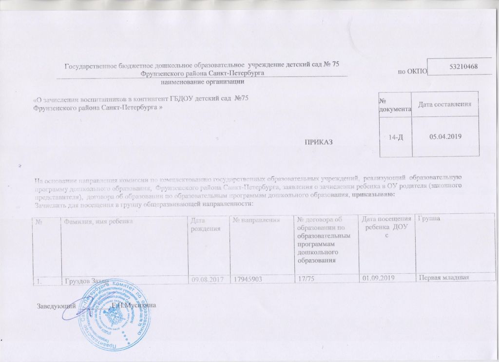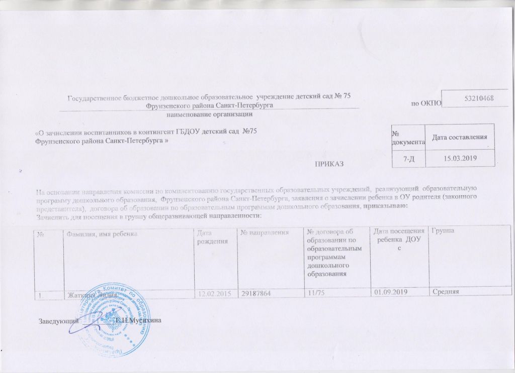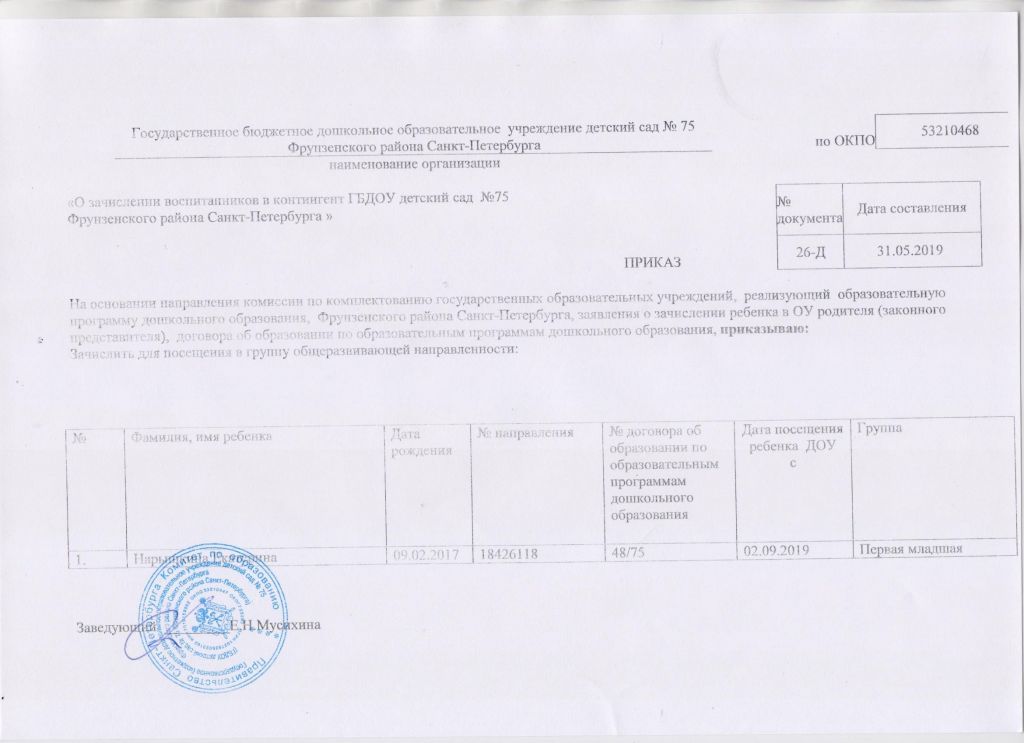 Распорядительный акт о зачислении ребенка в образовательную организацию
