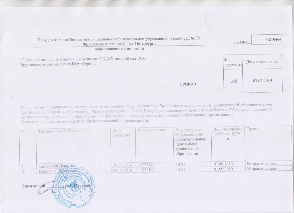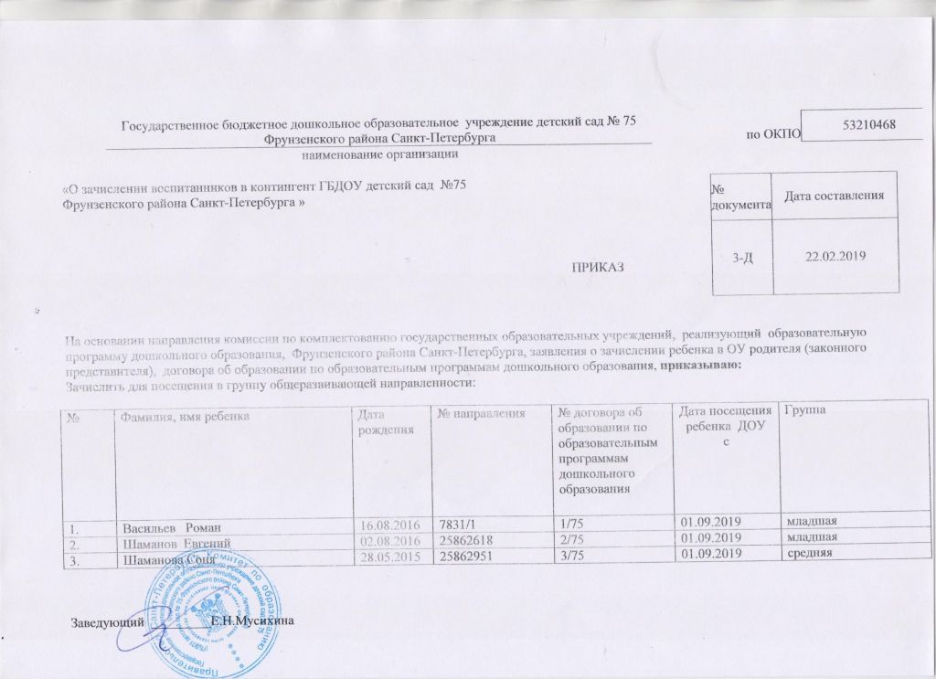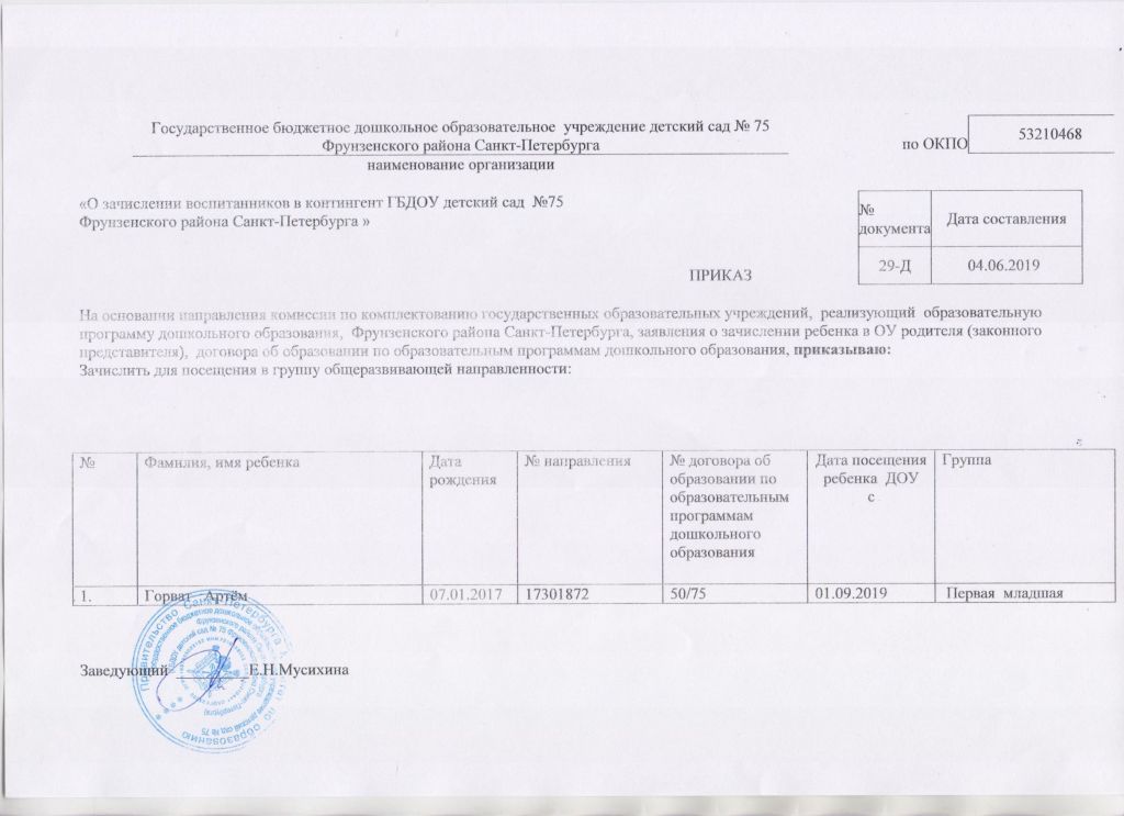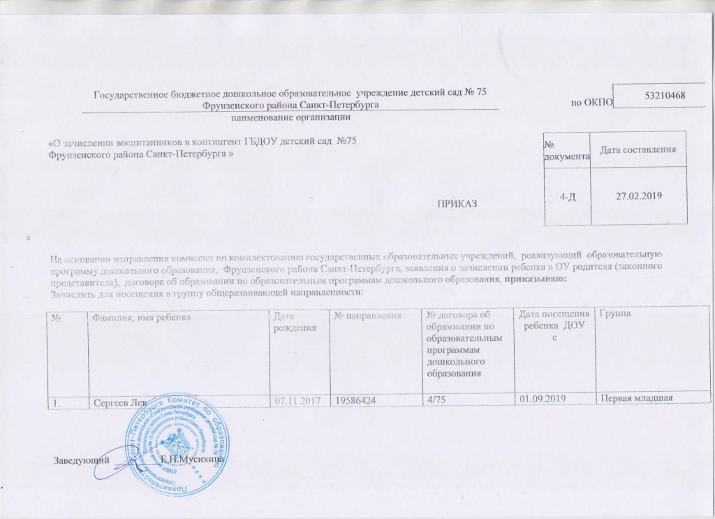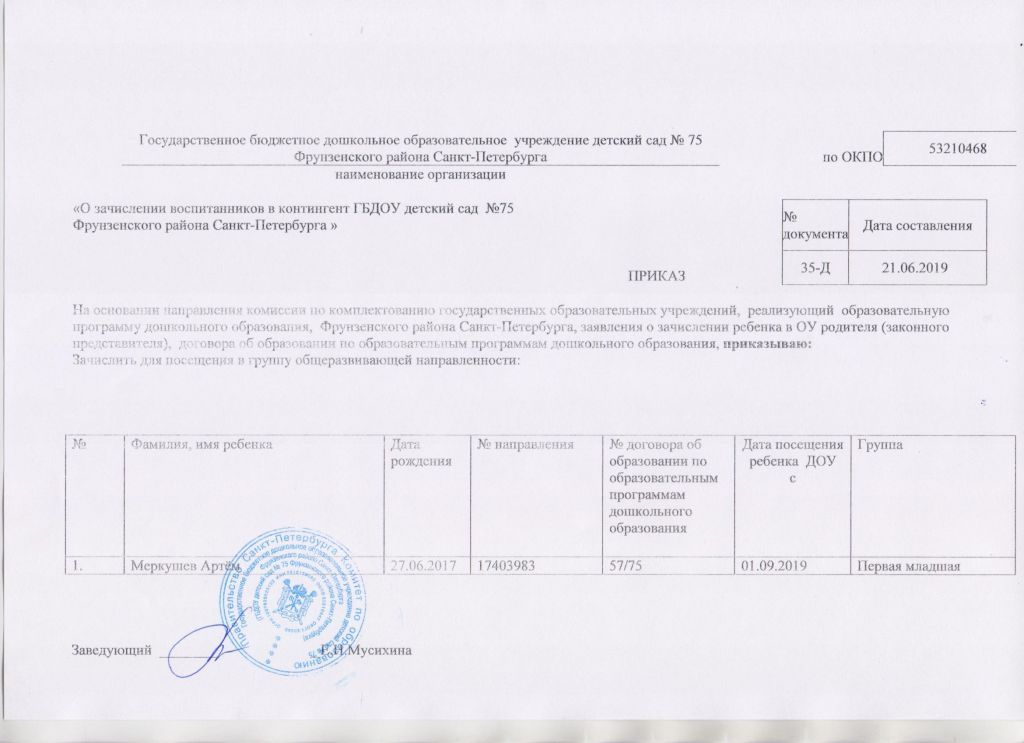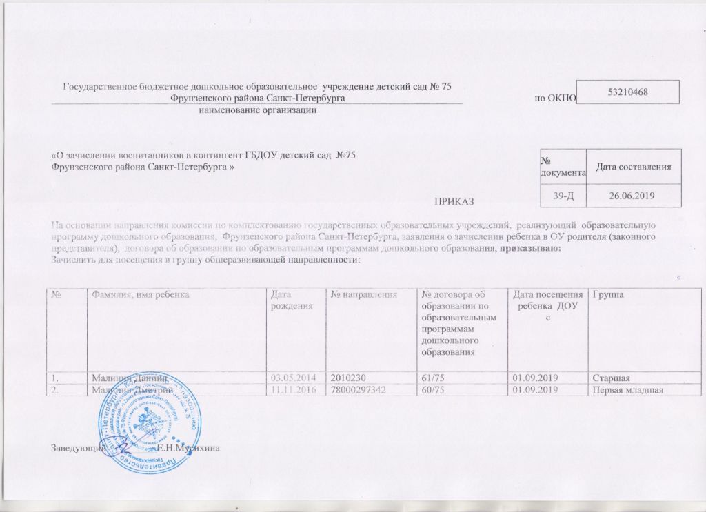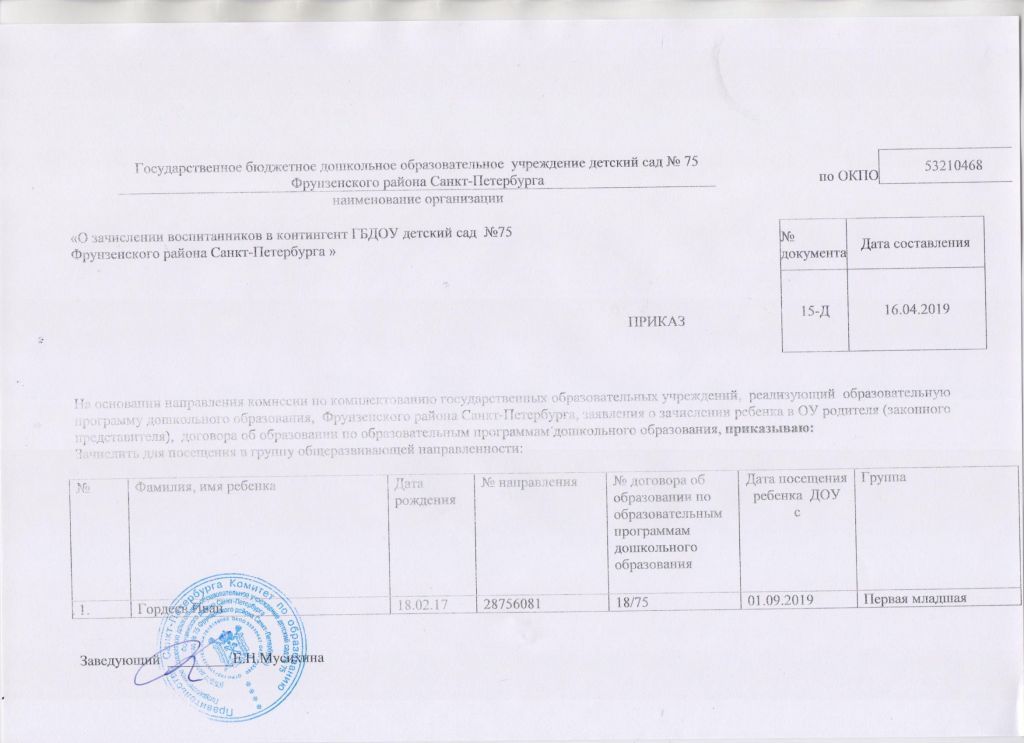 Распорядительный акт о зачислении ребенка в образовательную организацию