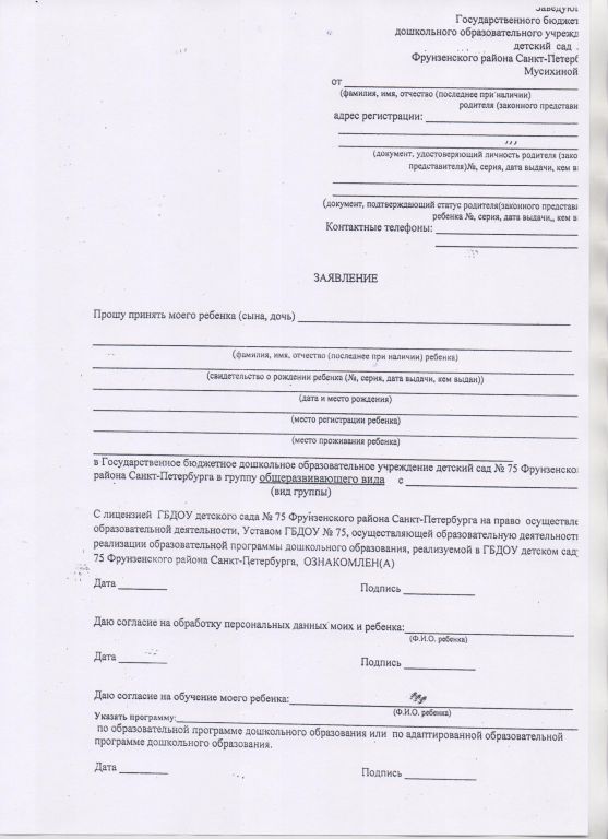 Примерная форма заявления о приеме в образовательную организацию
